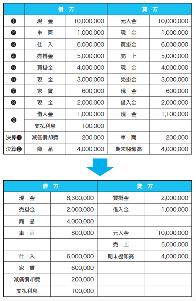 単純に足したり引いたりしてもよいのですが、集計をするのにボックス図といわれるフォームを使用すると、簿記の仕組みを理解するのに役立ちますので、是非マスターしてください。