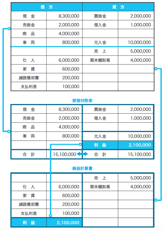 損益計算書の利益は、左右の差引きで利益210万円と計算します。1,000万円の元手で商売を始めて、1年間の利益が210万円となったわけです。次にその利益210万円は、貸借対照表の元入金に組み込まれることによって、貸借対照表の左側の合計が1,510万円、右側の合計も1,510万円で一致することになります。貸借対照表の左右は必ず一致してバランスしますので「バランスシート(B/S)」と呼ばれます。
