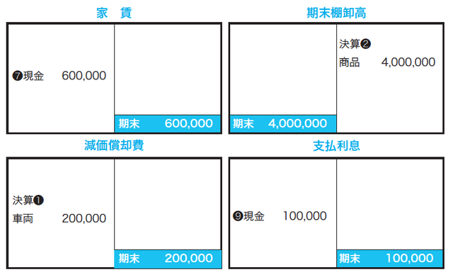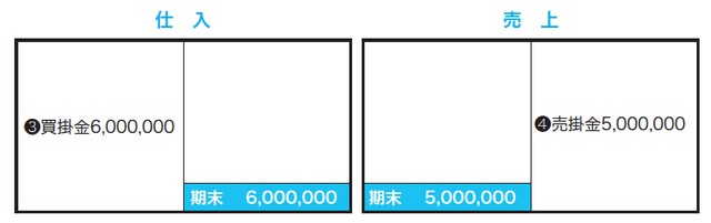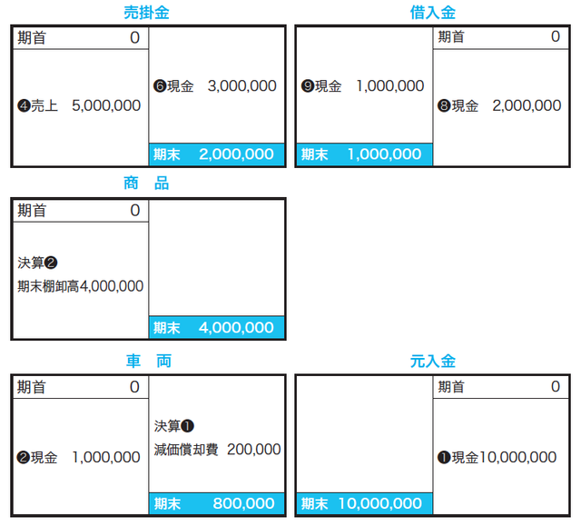 買掛金のボックス図は、負債なので右上からスタートです。開業年なので期首は0円です。仕訳❸は買掛金である負債の増加なので右側に記入し、仕訳❺は買掛金である負債の減少なので左側に記入して、差引きで左下の期末残高を計算します。売掛金、商品、車両は資産ですので、それぞれ左上からスタートします。