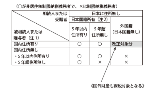 なお、制限納税義務者は改正されており、以前は課税対象とされなかった日本国籍のない相続人や受贈者が、国内に住所を有する被相続人や贈与者から取得した国外財産についても、相続税・贈与税の対象となります。