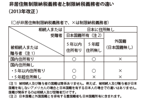 一方、制限納税義務者とは、相続または贈与により財産を取得した個人で、その財産を取得した時において日本国内に住所を有していない者で、非居住無制限納税義務者に該当しない者をいいます。要は、「国外に住所があり日本国籍を有しない相続人もしくは受贈者」と「日本国籍を有する相続人もしくは受贈者と被相続人もしくは贈与者のいずれもが、相続もしくは贈与開始前に継続して5年を超えて国外に住所を有している場合の相続人もしくは受贈者」のことです。