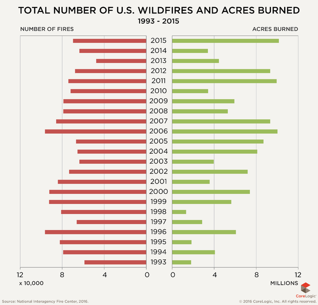 これは人口密集地が郊外(山火事危険地帯)へ向かって住宅開発が広がりを見せていることと相まって、山火事危険地域内での被害拡大よりは、風の通り道で近隣のコミュニティへ飛び火する傾向から来ていると言われています。
