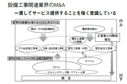 実際、この数年で目立ってきているのは同業者同士ではなく隣接業種とのM&Aです。たとえば、ビルを建設する場合、電気、空調、給排水などの工事が必要となります。今までは、ゼネコンが仕事を別々に発注し、それぞれの業種の企業が別々に請け負っていました。