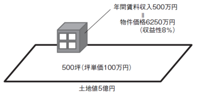 これはその物件から上がる賃料収入は少ないのだけれども、土地が広いケースです。図表を見てください。500坪の土地に2階建て4世帯のアパートが立っています。年間の賃料収入は500万円です。土地は坪当たり100万円の場所ですので土地値が5億円となります。