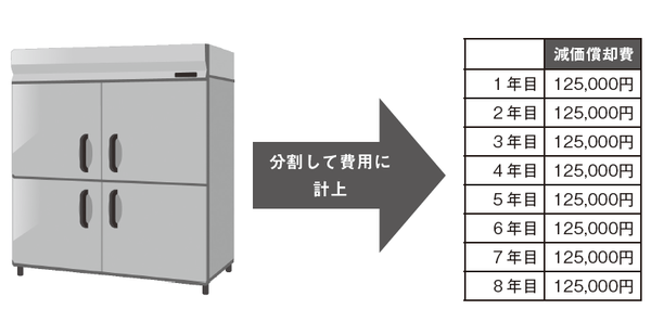 例えば、創業1年目に100万円の業務用の冷蔵庫を購入したとします。耐用年数は機械及び装置:飲食店業用設備に当てはまるので8年です。このとき1年目に100万円を支払ったので1年目に取得にかかった費用100万円を計上すると、2年目から8年目までは費用は0円で売上だけが計上されることになります。それでは正確な収益を計算することができません。そこで、費用収益対応の原則という、収益を得るために利用した期間に応じて費用計上することが、企業会計にとって望ましいものと考える原則を実現するために減価償却の方法をとります。
