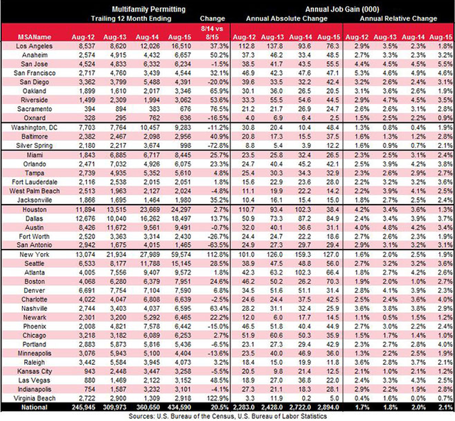 下記図表は、全米主要大都市圏の過去4年間における年ごとの賃貸住宅(アパート)建築許可戸数と雇用増加数・増加率をあらわしています。