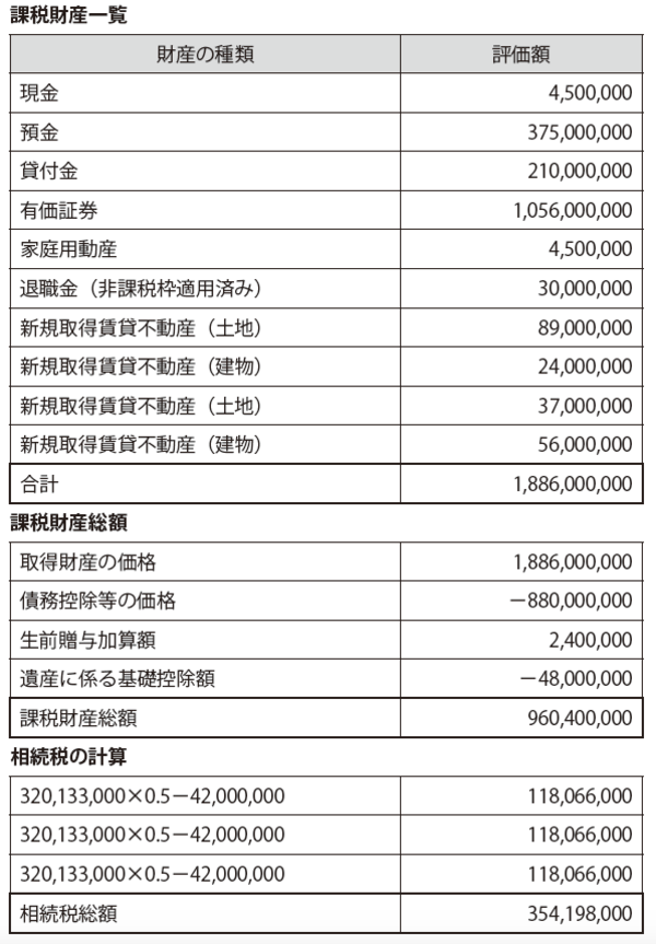 マイナスの財産と基礎控除等を差し引くと、財産の評価額は約9億6000万円になり、相続税の合計額も約3億5000万円となりました。こうして、Aさん一家の当初の希望通り、相続税額を現預金で支払える額まで下げることができたのです。