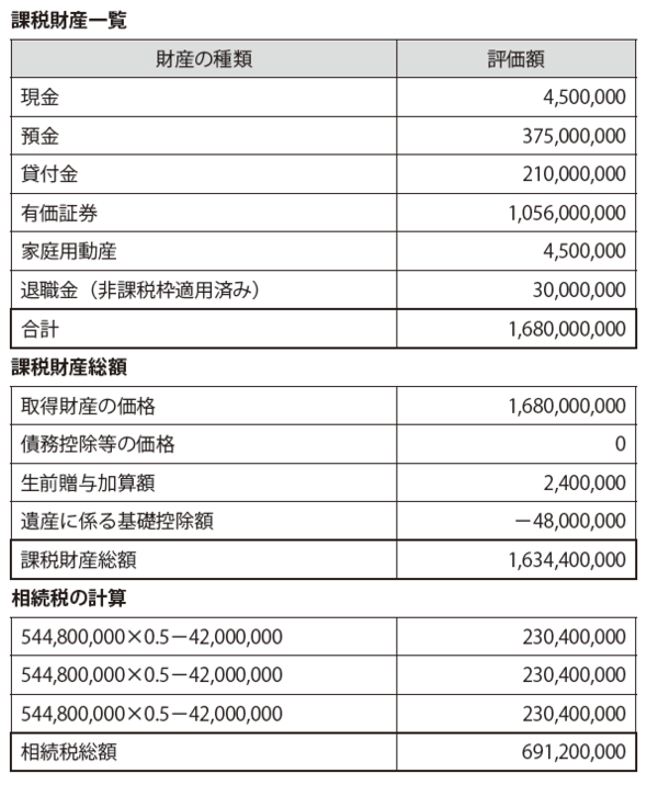 このままAさんが亡くなった場合、子1人あたり5億6000万円の財産を相続することになり、相続税額の概算は約6億9000万円になります。現預金でも4億円近くをお持ちのAさんですが、それでも納税資金として足りない状況です。