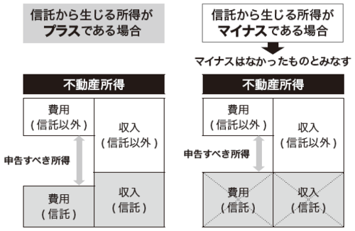 もし、信託した不動産からの所得が損失になると、その損失は、所得の計算上なかったものとされますので、他の不動産所得との損益の通算はできません。