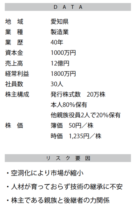 資本金は1000万円で、発行株式数は20万株。株主は代表者であるAさんと、親族であり役員を務めるBさん、Cさんです。そのうち、Aさんが8割を所有していました。主な保有資産は工場と事業用の土地。社員は30人です。