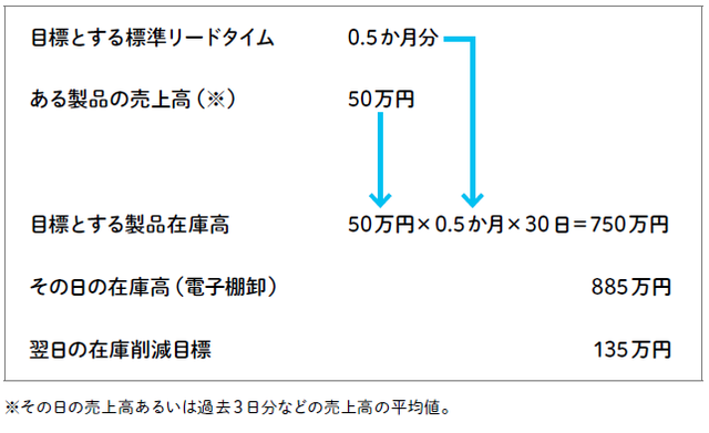 STEP2:それぞれの製品の日次の売上高(あるいは過去数日を平均した売上高)に、標準リードタイムを乗じて維持すべき在庫高を求める。