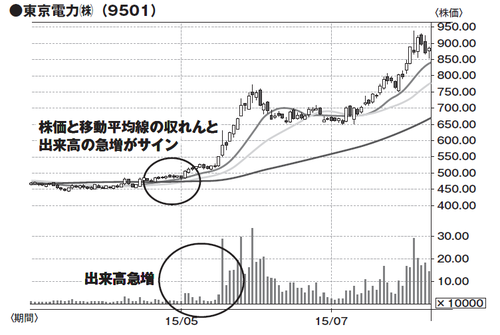 上記の図1のチャートをご覧ください。投機筋が介入し、相場を演出し始めたときには、必ず出来高が急増しています。目安は、前日の5倍は増えていること。一番良いのは前日の10倍、20倍と急増している場合です。