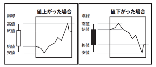ローソク足には、白いものと黒いものがあります。株価が前日よりも値上がりした場合に現れるのが、白いローソク足(陽線)。一方、株価が前日よりも値下がりした場合に現れるのが、黒いローソク足(陰線)です。