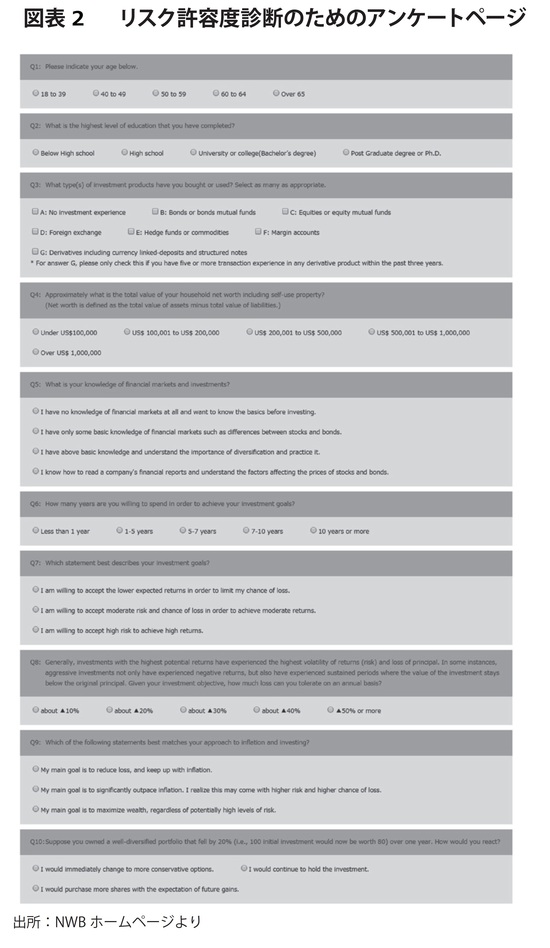 正確なリスク許容度の判定が行われないと、想定したよりも大きな損失を出してしまった、あるいはもっと利益を獲得したいのに、何年たってもほんのわずかしか儲からない……などということになってしまうかもしれません。では、質問の内容を簡単に紹介しましょう。このアンケートに基づいて、顧客一人ひとりに適した「ポートフォリオ」が提案されることになります。(図表2参照)