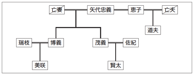 しかし忠義は、恵子には前の夫との間の子で、今は全く交流がない道夫がいるため、今後の相続で矢代家の財産は分散することがわかっており、茂義と博義の兄弟仲が良くないことも含めて、強く懸念 しています。