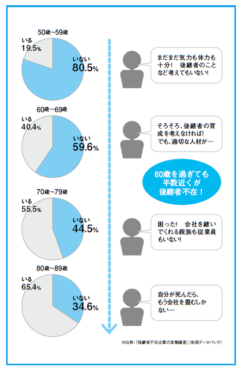 前出の調査によれば、社長の平均年齢は59.7歳と実に30年連続で上昇。また、後継者が不在などの理由から、社長交代率は過去最低の2.47%(2010年数値)に留まっています。調査の数値からは、後継者不足に加えて、事業の不振がダブルパンチとなり、後継者問題どころか、目先の対応で手一杯という姿が透けて見えます。