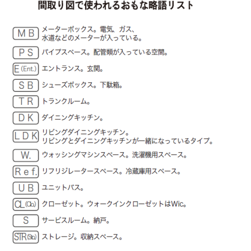 間取り図はすべて漢字で書かれているものもありますが、クローゼットを「CL」とするように、英語の略語がよく使われます。「PS」はパイプスペース、「MB」はメーターボックス、「UB」はユニットバスです。