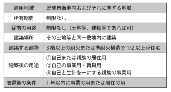 既成市街地内にある土地などを譲渡して、同一敷地内に地上階数3階以上の耐火建築物または準耐火建築物、建物の床面積の半分以上が居住用といった条件を満たせば課税が繰り延べされます。詳細は下記の図表をご参照ください。