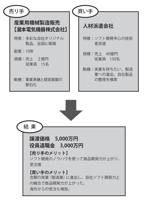 その中で私が可能性を感じたのが、ソフト開発を中心とした技術者派遣業を行っている会社です。売上高は40億円、従業員は150名という規模の人材派遣の会社ですが、実業を持ちたいという意向があり、製造業への進出や自社製品の獲得を模索していました。他業種であることから人材も完全に引き継がれまさに求めていた条件に合う相手だったのです。