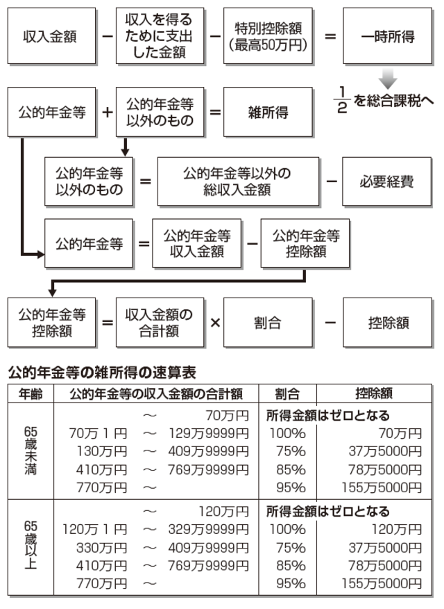 文字どおり雑多なものが含まれますが、とくに重要なのは厚生年金・国民年金・恩給などの公的年金などでしょう。公的年金等の雑所得の金額は、下記の図表のような速算表で計算されますが、65歳未満と65歳以上で計算が異なるので注意してください。