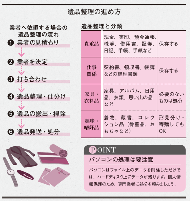忌明けの四十九日法要が過ぎたら、故人の遺品整理を始めます。たくさんの遺品を上手に整理する際には、「処分するもの」「保存するもの」「人に譲るもの」の3つに分類するのがポイントです。