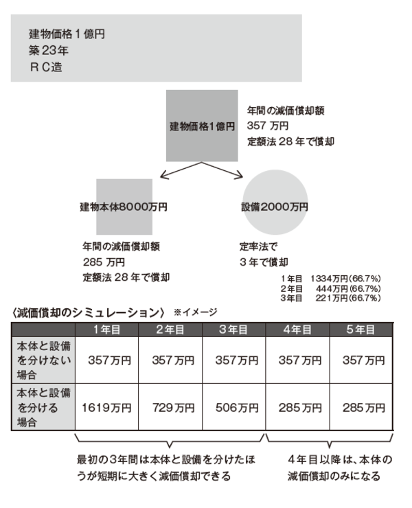 建物価格を大きく取ることは節税にとって大きな効果がありますが、その効果をさらに大きくするのが、建物本体と設備(給湯器やエレベータなど)に分けて償却をする方法です。