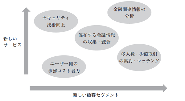 オンラインまたはモバイルでプラットフォームを構築することにより、窓口や書面ベースでのサービス提供と比較して、より低コストでより多人数の潜在顧客に対するリーチが可能となる。これによって、従来の金融事業者が費用対効果の関係でカバーできなかった多人数の少額の取引を効率的に集約し、マッチングするサービスを提供するビジネスが出現している。