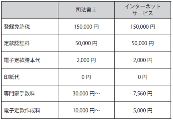 法人設立費用として、定款認証代、定款印紙代、登録免許税など。司法書士など専門家に依頼すると、それに加えて手数料が発生します。しかし、オンライン申請を利用することができるため、定款印紙代の4万円を節約できます。その他、印鑑を用意します。