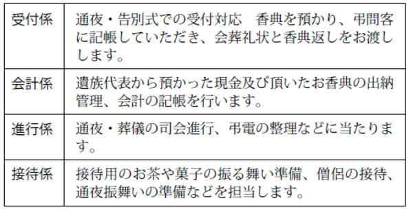 世話役は、喪主とともに、葬儀社と葬儀全般について打ち合わせを行い、葬儀を統括します。また通夜・葬儀告別式では、世話役の指示のもと受付係、会計係、進行係、接待係、案内係等が必要ですので、喪主の友人や親族の中から、あらかじめお願いしておきましょう。