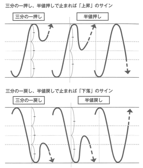なお、半値ほどは重要視されませんが、上げ幅、下げ幅の「三分の一」が節目になることもあります。「三分の一押し」で株価が反転した場合、これは強い上昇トレンドとされ、「三分の一押しは押し目買いのチャンス」という格言が知られています。