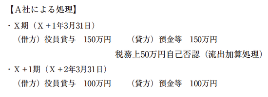 A社はX年11月30日支給分150万円については、増額分の50万円を自己否認して届出額の100万円のみ損金の額に算入している。X+1年5月31日支給分100万円については、全額損金算入している。