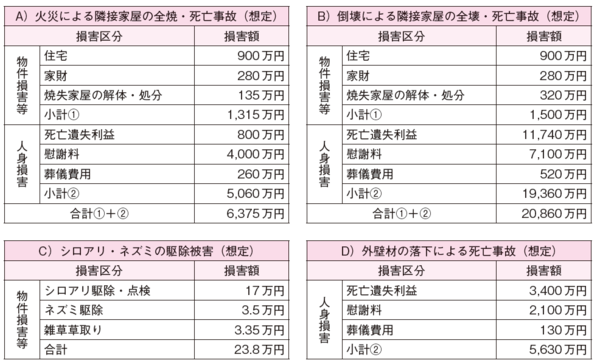 公益財団法人日本住宅総合センターが国土交通省住宅局住宅総合整備課住環境整備室の提案により、平成24年度プロジェクトとして実施した「空き家の発生による外部不経済の実態と損害額の試算に係る調査」では、空き家発生による外部不経済の損害額について、次の4つの想定するケースで試算がされています。