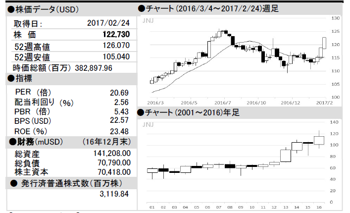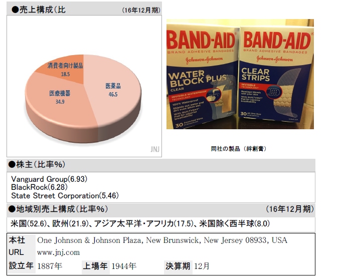 傘下企業230社超を通じ、世界60カ国・地域でヘルスケア製品の開発・生産・販売を手がける。ベビーオイルや化粧品、医療機器、医薬品などを製造。絆創膏の「バンドエイド」など、数多くのヒット商品を投入してきた。消費者向け製品よりも、医療機関向け製品の売上比率が大きい。医療機器事業は、整形外科、外科治療向けが稼ぎ頭。医薬品事業では、抗リウマチ薬「レミケード」が主力(2016年12月期末)。2012年、骨接合材で米最大手のシンセスを買収した。