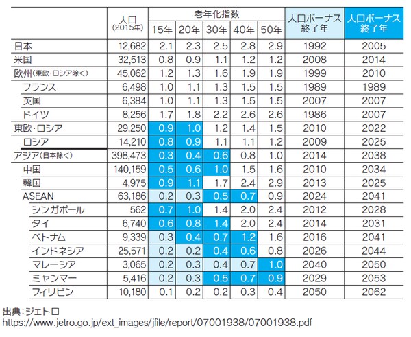 また、世界でもっとも長く人口ボーナス期(総人口に占める生産年齢人口比率が上人口1億人突破昇する期間)が続く国とも言われ、2015年のジェトロの発表によれば、2062年まで人口ボーナス期が継続すると試算されています。