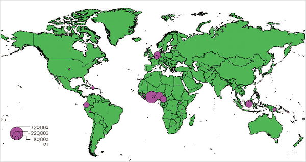 プランテーション作物の統計を見ていると、輸出国と輸入国の両方にランクインしている国があります。これは、旧植民地と宗主国の経済的な結びつきにより、原料産地と加工地が明確に分かれている作物に見られます。カカオ豆を例に、統計を地図にしてみました。
