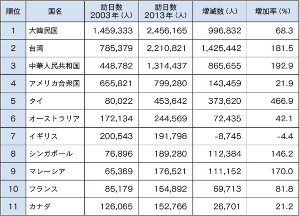 図表は、日本への外国人旅行客の推移を2003年と2013年とで比較したものです。全体的に増加している中で、特に中国・台湾と、東南アジアからの旅行客が増えているのが特徴です。