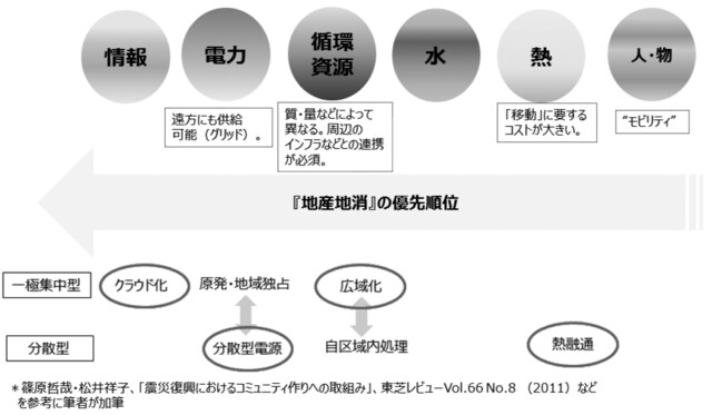 同図の下側には、それらを巡る議論の方向性を「一極集中型」か「分散型」かという視点で整理している。