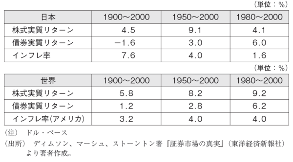 イボットソン・アソシエイツ・ジャパンが集計した1951年12月から2014年3月までの日本市場のデータをみると、株式(東証1 部)の年率複利でみた投資収益率は10.2%、長期国債は6.0%、預金は3.9%、インフレは3.1%という結果となっている。
