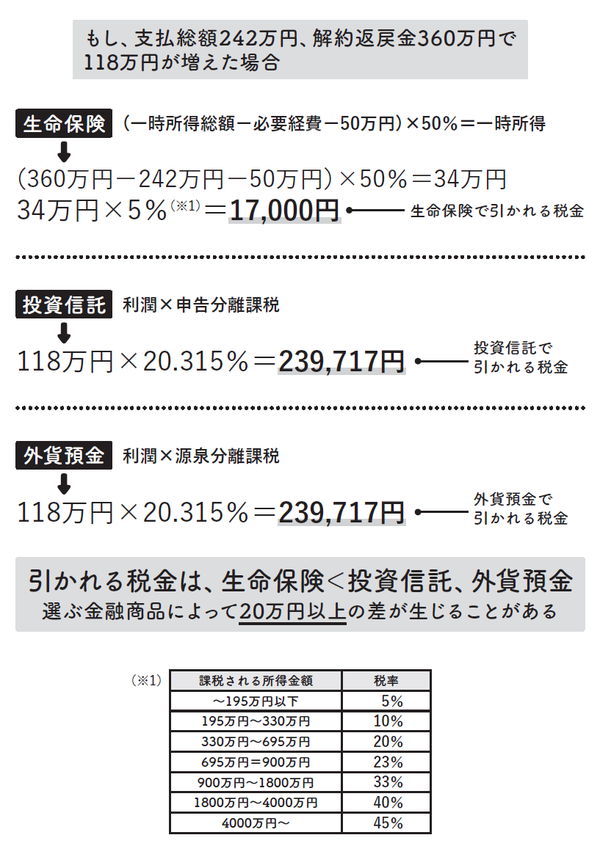 「じゃあ、支払総額242万円で解約返戻金は360万円の金融商品を持っていたとしようか。つまり、118万円増えた状態だね。すると、(360万円 - 242万円 - 50万) × 50% = 34万円。34万円にこの所得額に対する税率の5%をかけた1万7000円が所得税ということになる(図表)」