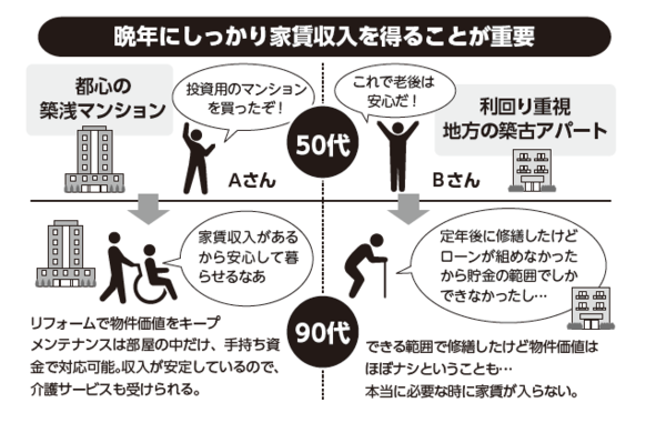 マンション経営から得られる家賃収入が最も必要な時期は、人生の晩年である80代、90代といった年齢の時です。その時に家賃収入を得られない物件では、老後の対策になりません。確実に家賃が得られる物件を選ぶことが重要です。