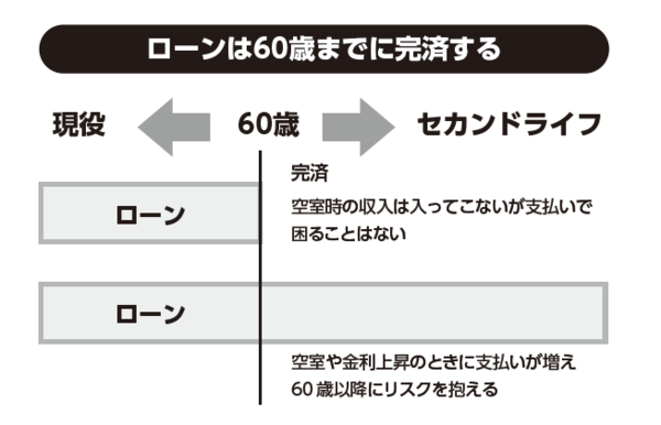 図表1のように60歳までにローンを完済できれば、それ以降は、もし空室になっても、ローンの支払いに困ることはありません。、またローンを完済していれば、まとまった資金が必要なときには、物件の売却も選択肢に入ります。