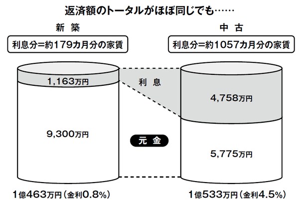 新築と中古、4%弱の金利差が、支払うトータルの額にこれだけの差を生み出します。