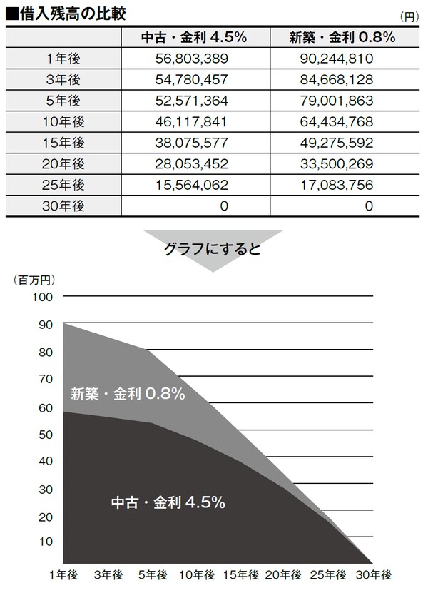 ここでは前回、例に出した「金利4.5%で5775万円の融資を受けた中古物件」と「金利0.8%で9300万円の融資を受けた新築物件」で、借入残高について見ていきます。