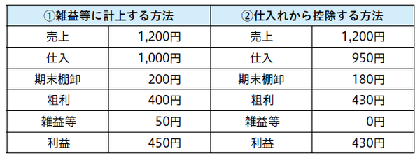 ①の営業外収益とする方法は、仕入割戻しの計上時に全額課税対象となってしまいます。②の方法は、仕入れの控除項目として処理することで、その事業年度の総仕入高が減少するとともに仕入単価も減少します。低くなった仕入単価をもとにすれば期末在庫の単価を引き下げることが可能となり、結果、その分の利益が減少し税金を低く抑えることができます。ただし、期末在庫の減少分は翌期以降に商品が販売されれば解消しますので、課税の繰り延べということになります。