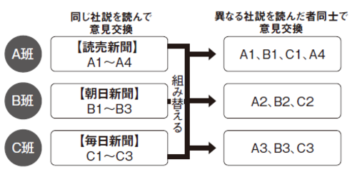 3.10分ほど時間を取り、A班は読売新聞、B班は朝日新聞、C班は毎日新聞を、それぞれ集中的に読んで、自分なりにポイントだと思う箇所に傍線を引いていくよう指示する