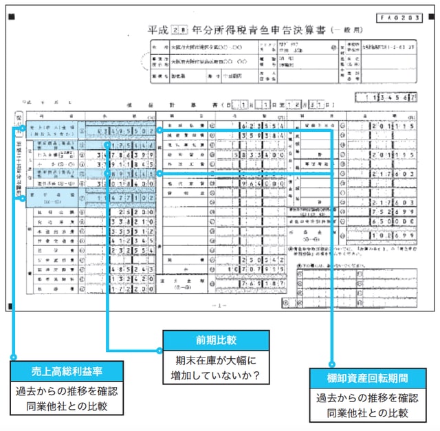 損益計算書の期首商品棚卸高と期末商品棚卸高の増減を確認してみます。大幅に増加している場合には、理由を確認してみましょう。