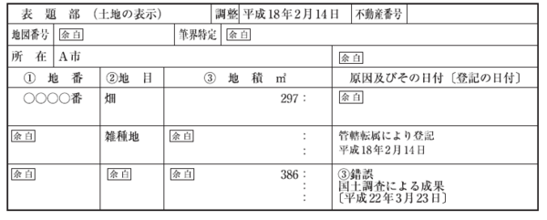 297㎡であった畑が386㎡に変更されています。原因及びその日付欄に「国土調査による成果」とあります。地籍調査(国土調査の中の1つの調査)により面積の相違が判明したことにより面積の変更(地積更正)登記がされたものです。