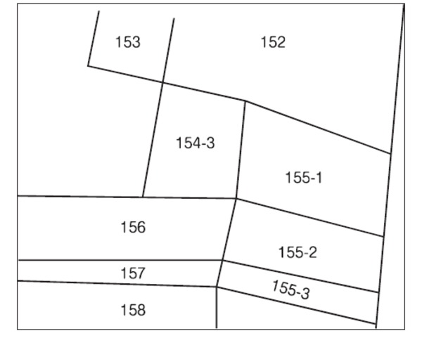 実例として【1.公図】を参照して下さい。155-1の土地と154-3の土地では、155-1の土地の方が広く見えます。