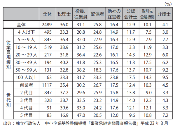 M&Aをする際に、誰をアドバイザーとして相談するのがベストなのでしょうか。2011年の「事業承継実態調査報告書」によると、事業承継をするにあたって社長たちが相談相手として多く選んでいるのは、第1位が税理士、次いで役員・従業員、配偶者などの身内関係、その次に他社の社長、公認会計士、取引先金融機関、弁護士、コンサルタントとなっています。