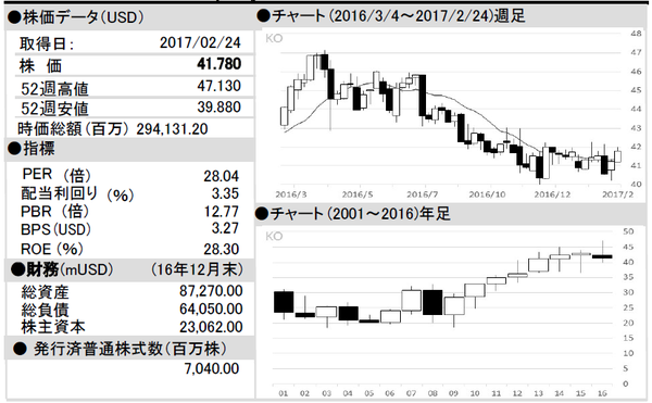 部門別の売上高は、北米とアジア太平洋がそろって8%増と堅調だったものの、ヨーロッパ・中東・アフリカとラテンアメリカはともに4%減、ボトリング投資は20%減に落ち込んだ。全体の税引き前利益は、66.51%減の5億1500万ドルに細った。取引の損益や資産の減損・再編などを考慮した場合、調整後の希薄化後EPS(非GAAP)は0.37ドルとなる(市場予想は0.367ドル)。会社側は17年通期の「organic revenue」を約3%増、調整後の希薄化後EPS(非GAAP)を1~4%減と予想した。